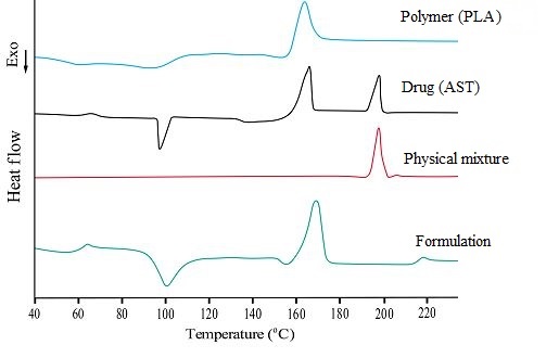 Fig. 11: DSC of astragalin, PLA, physical mixture, and nanoformulation