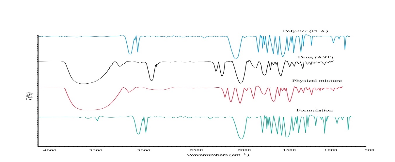 FTIR analysis is used to study the interactions between astragalin and the polymer PLA used in the formulation. The infrared spectra of astragalin, the polymer used, their physical mixture, and the formulation of the same were shown in fig. 12. The IR of the mixture of drug sample and PLA were found to be within the specified range. Hence there is no interaction between the drug sample and the polymer likely to be used in the formulation and can be used in the formulation [18]. Astragalin procured their entire characteristic peak in the physical mixture. That is a significant peak 806-1653 were retained in the physical mixture. The frequency vibration of C=C stretching of AST at 1653 and 1613 cm−1 shifted to 1686 and 1628 cm−1, respectively. The out-of-plane C−H bending at 806 cm−1in AST shifted to 795 cm−1 in the complex. Other minor changes (shifting/intensity variation) were also observed in AST at 1362 cm−1 (in-plane OH bend), 1208 cm−1(C−O stretching), 1508 and 1448 cm−1 (C−C stretching (in the ring)) based on FTIR spectra investigation no chemical interaction were observed between drug and polymer.