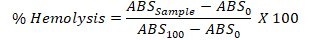 Where ABS0 and ABS100 are the absorbances of the solution at 0 and 100 % hemolysis, respectively.