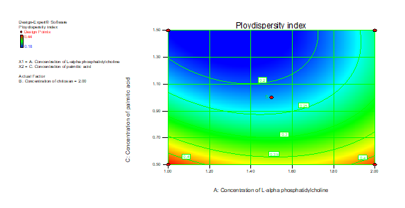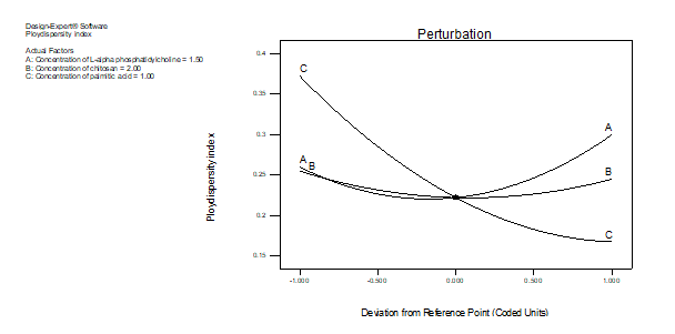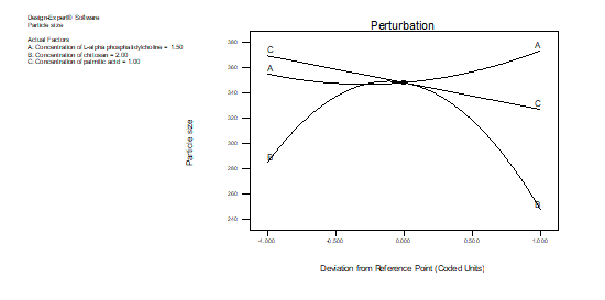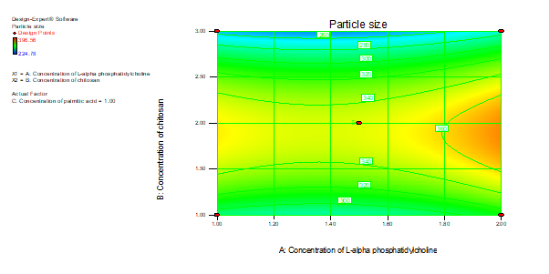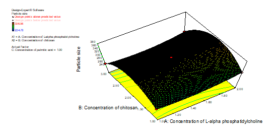Methods: A 33Box-Behnken design was used to determine the influence of L-α-Phosphatidylcholine (A), the concentration of chitosan (B) and concentration of palmitic acid (C) factors affecting particle size, and polydispersity index. The individual effects of these factors on particle size and polydispersity index were depicted in perturbation plot, response surfaces and counterplots based on Derringer’s desirability approach.