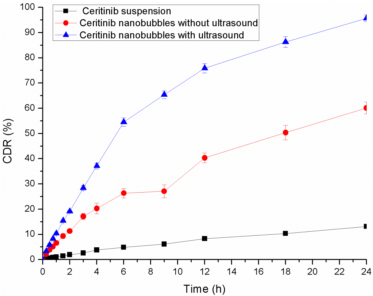 The amount of drug released from nanobubbles was significantly higher than that from the ceritinib suspension. Significant difference was observed between the drug released from ultrasound assistance and non-ultrasound assistance. After 6 h, 54.54 % of ceritinib was released under sonication, whereas only 26.34 % were released without sonication. Without ultrasound, only 60.12 % of ceritinib was released after 24 h. In contrast, almost 95.67 % of ceritinib was released with ultrasound. The results suggested that ultrasound assistance may promote the release of ceritinib from the nanobubbles due to the cavitation effect (fig. 9).