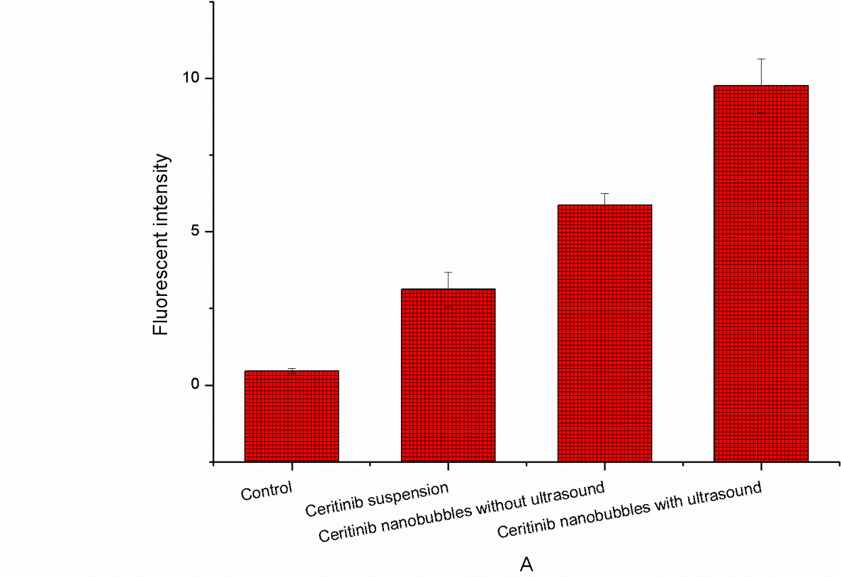 The cellular uptake of ceritinib and ceritinib-loaded nanobubbles was assessed through confocal laser scanning microscopy. At various time intervals, cells were photographed by using confocal laser scanning microscopy under filtered blue light with excitation wavelengths of 405 nm [24]. Using fluorescent microplates, the fluorescent intensity was measured at excitation wavelengths of 503 nm and emission wavelengths of 528 nm. There was a triplicate of every trial.