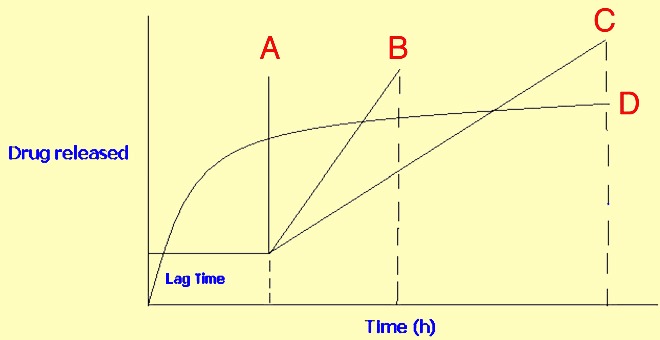 Fig. 1: A. Represent pulsatile drug release pattern after an interval of lag time [30], B. Retard Release after a certain lag period. C. Continued release after a lag time. D. Prolong release without the involvement of lag time