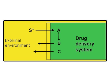 Fig. 4: Stimuli induced pulsatile drug delivery [30], S*= Outer stimuli, A = Internal substrate activation by the stimuli Presence, B= Product formed after stimuli changes, C = Drug