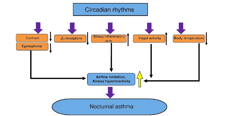 Martin RJ. Nocturnal asthma: circadian rhythms and therapeutic interventions. Am Rev Respir Dis. 1993 Jun;147(6 Pt 2):S25-8. doi: 10.1164/ajrccm/147.6_Pt_2.S25, PMID 8494197.