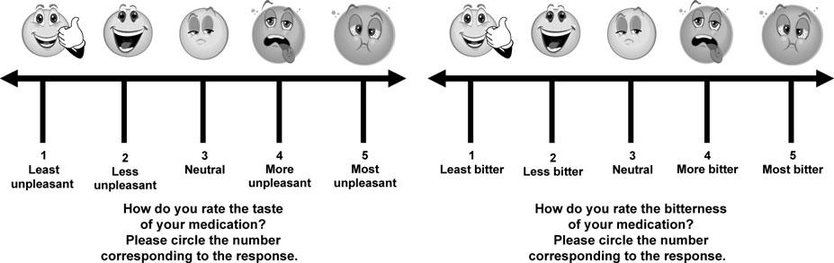 In vivo taste masking evaluations for pure APIs, polymers, and all formulations were carried out in compliance with the World Medical Association's Code of Ethics (Declaration of Helsinki); also, an ethical committee approved this study, Faculty of Pharmacy, Cairo University, approval no. PI 1607. Volunteers were informed of the study’s aim, procedures, and risks. All volunteers provided written informed consent before undergoing any study procedure. Twelve healthy volunteers (age 18–25) of either gender were chosen (male = 6, female = 6). 100 mg of blends were kept in the mouth for 60 seconds before being spat out. Mineral water was utilized to wash each volunteer's mouth in between the examination of two samples. The bitterness intensity scale (fig. 1) was used to record the bitterness instantly, with 1, 2, 3, 4, and 5 indicating least unpleasant, less unpleasant, neutral, more unpleasant, and most unpleasant [19]. Results are presented as mean value±standard deviation (SD), n=3.