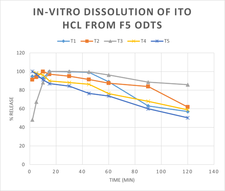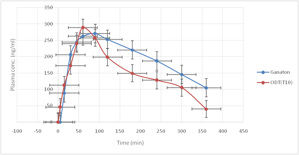 The corresponding pharmacoeconomic parameters of Itopride HCl (Cmax, Tmax, and AUC (0–6) and relative bioavailability) in two different forms were listed in the table (8). The Tmax of Itopride HCl was reduced to 60 min with increased Cmax (288.789) from ODT compared to the Tmax of 90 min with low Cmax 270.8 for the marketed tablets. The rapid onset of action with great Cmax value of the drug was achieved by application of the ODT form of our drug.