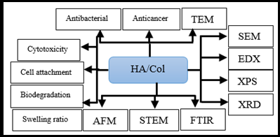 The morphology of the HA/Col composites was determined by using TEM, AFM and SEM. These instruments were used to identify the homogeneous of the surface sizes and shapes of the particles. The biological properties of the composites were determined by using many assays such as antibacterial, anticancer, degradation, swelling ratio and cell attachment. The results of the previous studies showed good ability for the composites to be used as osteoconductivity and biocompatibility [69, 72]; table 7 shows more details about them.