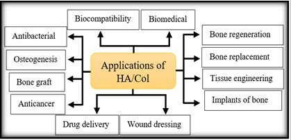 The present studies have been taken to trend to the drug-delivery system. The systems of the drug delivery has the ability to use in the bone pathologies such as osteosarcoma, osteomyelitis, and osteoporosis. The composites of HA/Col were incorporated with wide range of drugs such as paclitaxel [23], cisplatin [55], vancomycin [56], tetracycline [57] and alendronate [58]. The most studies have been focused to incorporate the composites with the drugs to design new antibiotic for inhibition of bacteria growth [59]. The other applications of using drugs in the drug delivery system are anti-cancer [23], biocompatibility [60], and anti-osteoporosis [61].