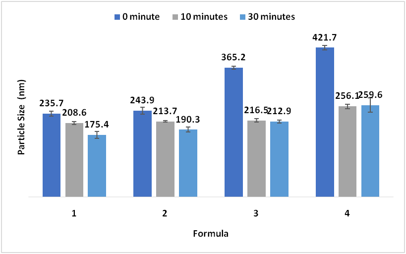 Particle size and particle size distribution of liposomes were measured using a Particle Size Analyzer (PSA) with the Dynamic Light Scattering (DLS) method. There are four formulas with variations in sonication time (table 1). Longer sonication time resulted in smaller particle size and polydispersity index (fig. 1). The optimum sonication time was 30 min with 30 seconds on and 30 seconds off.