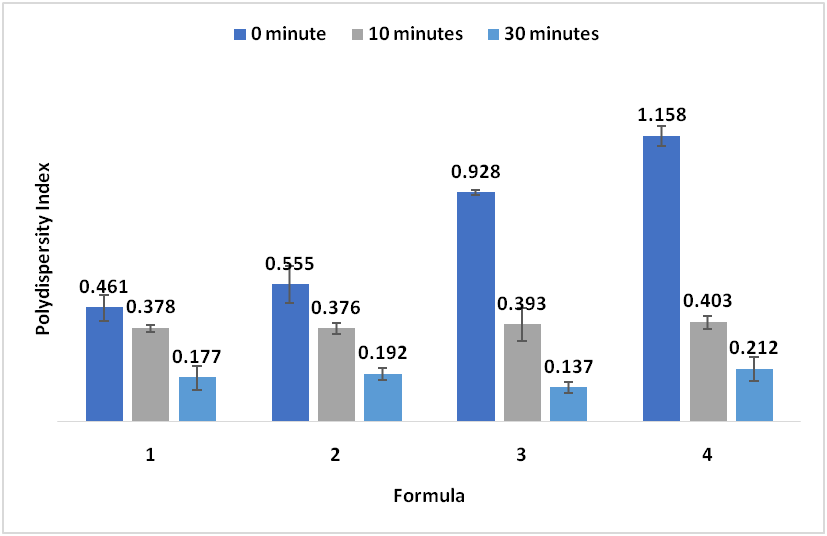 Particle size distribution which is indicated by the Polydispersity Index (PDI) is a key aspect to be considered in the characterization of liposomes. The particle size distribution close to zero shows the good distribution of particles [30]. Small PDI values indicate the stability of the formula. Higher PDI value indicated that the particles are not uniform and tend to flocculate quickly. PDI value of<0.3 is considered to be acceptable and indicates a homogeneous population of phospholipid vesicles [31].