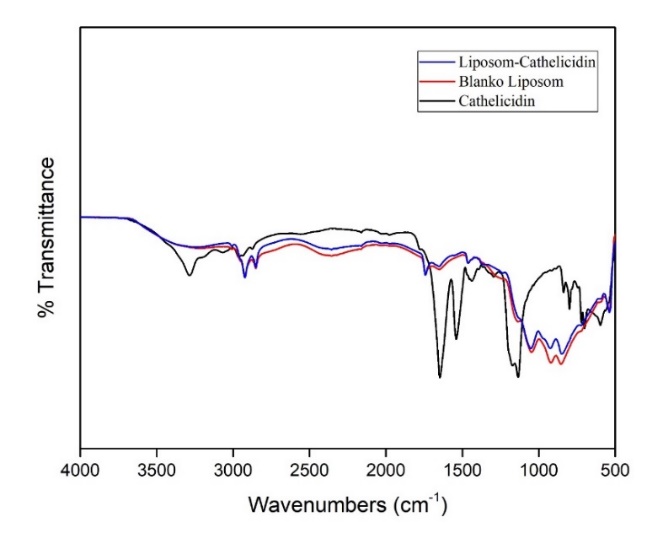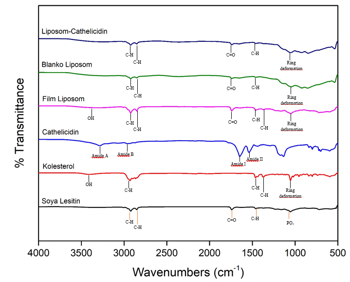 The interaction between cathelicidin and other chemicals in liposomes were evaluated by FTIR spectroscopy. Spectra were recorded using a Thermo Scientific Nicolet iS5 Infrared Spectrometer. The samples were poured on the FTIR plate and the spectrum were recorded at 4000 cm-1–400 cm-1. Then the spectra were compared to determine changes and interactions [25].