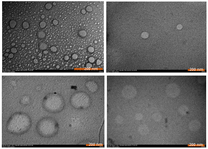 Fig. 5: Morphology of liposomes as (a) F2 with 50,000x magnification, (b) F2-LL37 with 30,000x magnification, (c). F3 at 30,000x magnification, (d) F3-LL37 at 30,000x magnification