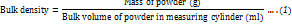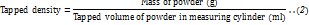 Bulk density and tapped density were determined by pouring 5 mg of powder into a 25 ml graduated cylinder and the bulk volume was noted. Then the cylinder was subjected to 50 tappings and the tapped volume was also noted. The bulk and tapped density were calculated by using Equations 1 and 2 [16, 17]. All the measurements were performed in triplicates for each batch.