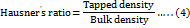 It is an index of flow properties of powders that is related to the inter-particle friction and is calculated as shown in Equation 4 [19]. The relationship between Hausner’s ratio and flow character is given in table 2 [20].