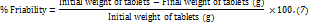 The friability test is the most effective way to access the resistance of tablets towards breakage while shipping, storage, transportation, and handling before use. It was measured for twenty tablets from each formulation taken randomly, weighed, and subjected to 100 revolutions at a speed of 25 revolutions per minute (rpm) in a Roche friabilator. The final weight of the tablets was measured after dedusting. The friability was calculated by using Equation 7 [15].