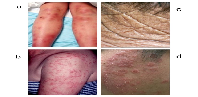 Fig. 1: (a)Erythema nodosum(b) Subacute cutaneous lupus erythematosus(c) Extensive nuchal elastosis resulting from many years of sun exposure(d) Erythematous pruritic plaque on the cheek