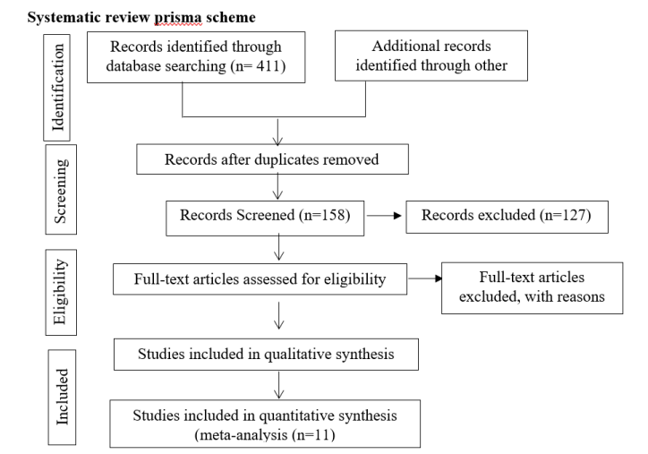 There were 412 citations generated from the electronic database search and manual filtering: 254 were excluded as duplicate records and 127 citations that did not meet the inclusion or exclusion criteria were excluded: 31 potential and relevant citations were retrieved as full-text documents and examined in more detail (fig. 1). 20 text documents were issued because it was a recurring report. Finally, a total of 11 studies were obtained with 2787 patients meeting the selection criteria (table).