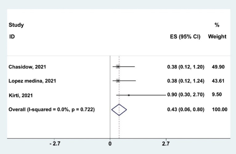Test for heterogeneity were found: χ2 =0.65, df=2, p=0.722, I2 =0% while test of overall effect: z= 2.28, p = 0.023. The pooled OR for escalation of cure for three studies reporting these data were 43% (95% CI, 0.06-0.08). Heterogeneity or variation between studies that investigated the effect of ivermectin administration in COVID-19 patients on day escalation of cure was statistically significant.