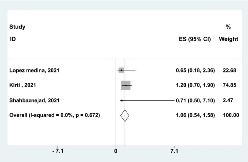 Test for heterogeneity were found: χ2 =0.79, df=2, p=0.672, I2 =0% while test of overall effect: z= 4.01, p = 0.000. The pooled OR for length of stay or hospitalization for three studies reporting these data were 100.6% (95% CI, 0.54-1.58). Heterogeneity or variation between studies that investigated the effect of ivermectin administration in COVID-19 patients on length of stay or hospitalization was statistically significant.