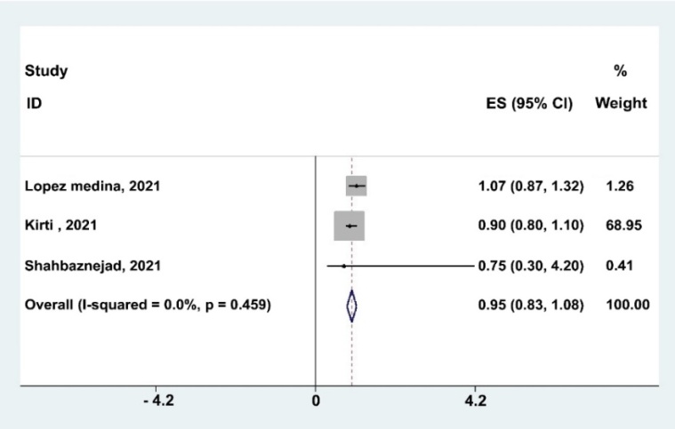 Test for heterogeneity were found: χ2 =1.56, df=2, p=0.459, I2 =0% while test of overall effect: z= 14.97, p = 0.000. The pooled OR for symptom reduction for three studies reporting these data were 95% (95% CI, 0.83-1.08). Variation between studies that investigated the effect of ivermectin administration in COVID-19 patients on symptom reduction might not be important but statistically significant.