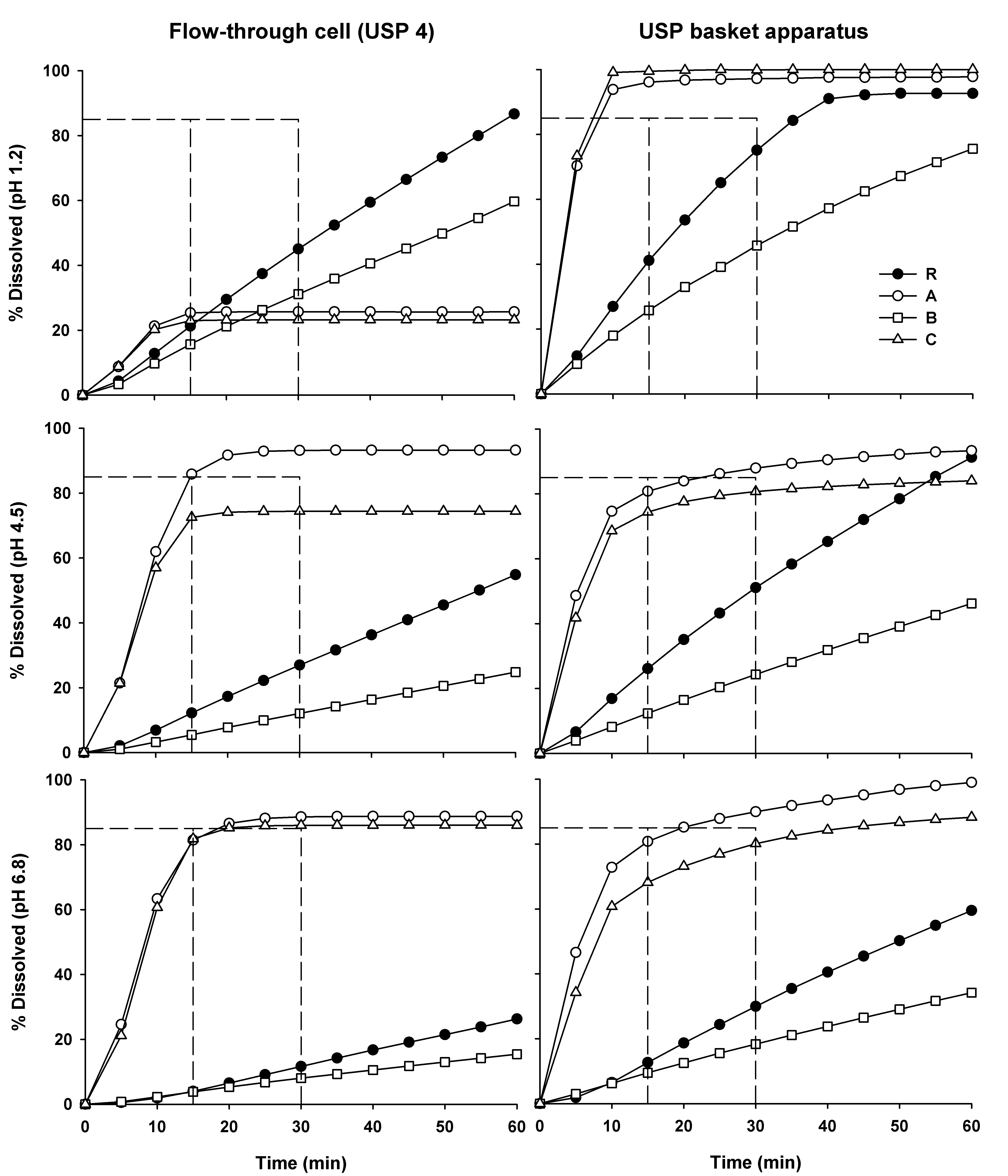 | pH | Key | Flow-through cell (USP 4) | USP basket apparatus | ||||||