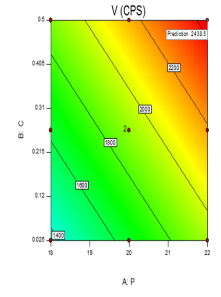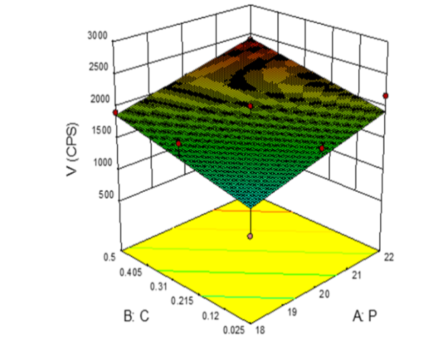 The result of multiple linear regression analysis showed that both the coefficients b1 and b2 bear a positive sign. Increment in the concentration of X1 (Poloxamer 407) and X2 (Chitosan) resulted in a linear increase in the viscosity.