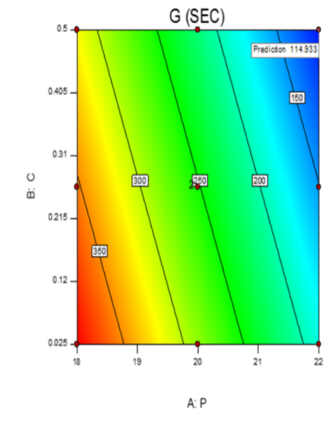The responses of gelation time were fed in the software. An equation for response Y2 was produced as a function of independent variables and expressed as follows-
