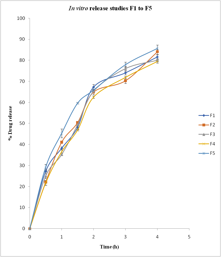 Fig. 4: In vitro release studies for formulations F1–F5, Note: All data is expressed as mean±SD, n=3