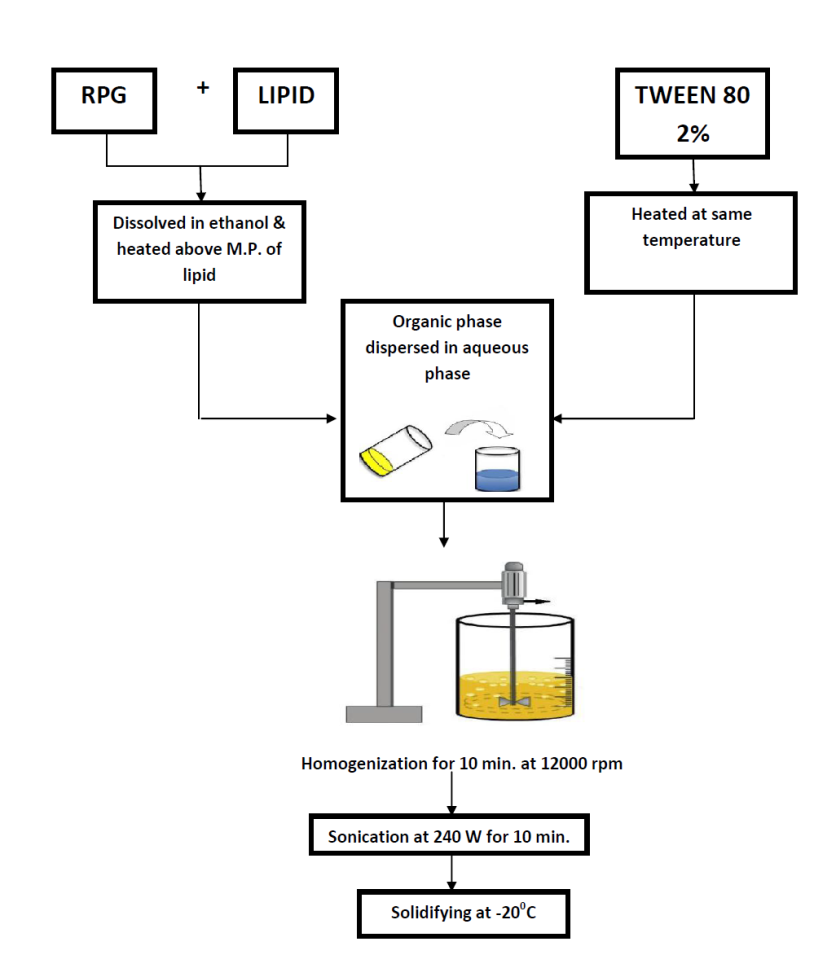 The SLN and NLC were made using the solvent injection approach, which involves intensive solvent diffusion over the solvent-lipid phase in the aqueous phase followed by solvent evaporation, resulting in increased stiffness of lipid nanoparticles. Prior to homogenization, high-speed stirring was used to generate a pre-emulsion phase, RPG was disseminated homogeneously in the molten lipid, and an ethanol solvent was used. To keep the pre-emulsion at or above melting temperature, a hot water bath was utilized.