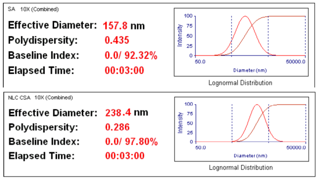 The particle size and potential zeta distribution of the preparation SLNs and NLCs populace were measured in view of the dynamic light scattering (DLS) procedure utilizing a laser scattering particle size/zeta analyser (Malvern, model Nano ZS, UK). Considering particle size analysis, all samples were diluted with distilled water to yield a suitable scattering intensity and every value was estimated in sets of three [28].