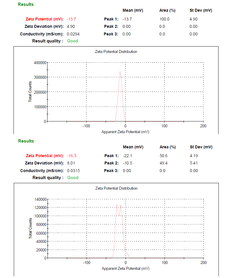 | Zeta Potential | -13.7±1.80 | -11.6±1.26 | -16.3±4.32 | -14.8±1.23 | -15.9±3.65 | -14.02±1.64 | |