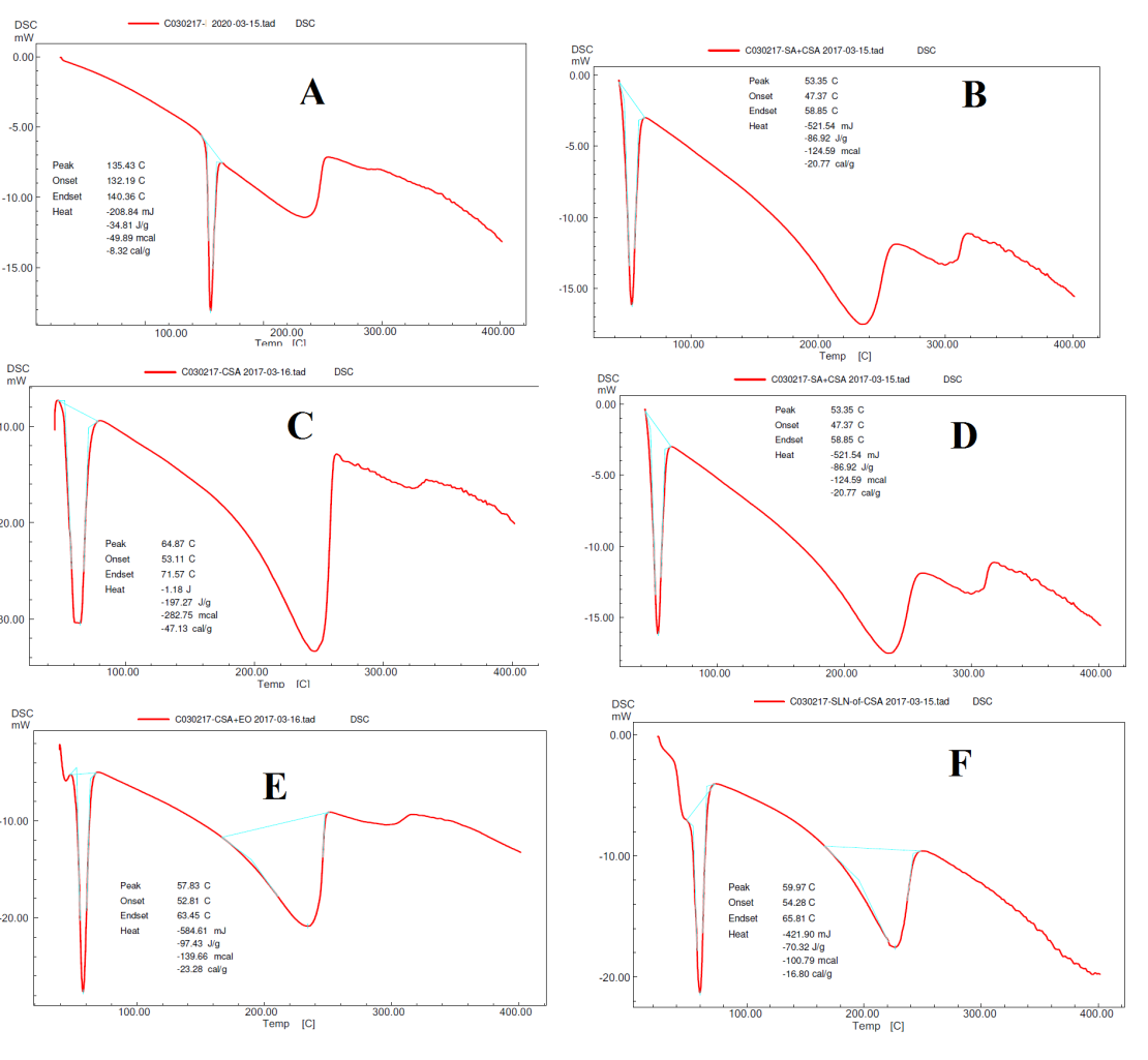Fig. 4: DSC Thermograms A) Repaglinide B) Cetyl alcohol and oleic acid blend (70:30) C) Cetyl Alcohol D) NLC Formulation E) Blend of cetyl alcohol oleic acid tween 80 F) SLN formulation