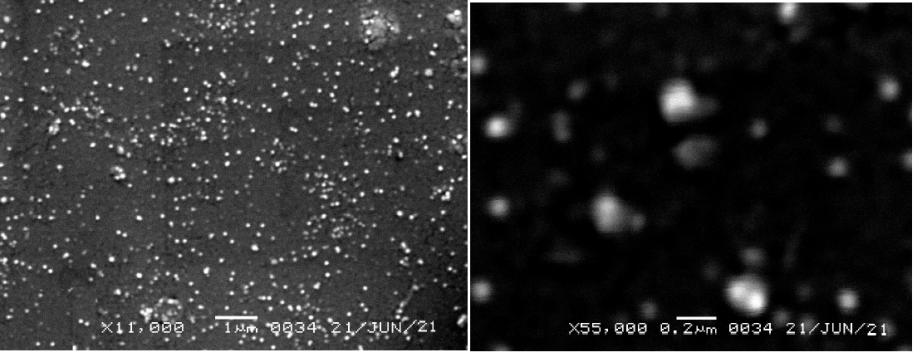 Prepared formulation SLN and NLC characterized for its size, shape and morphological properties with the help of scanning electron microscopy (SEM). The coating of lyophilized nanoparticles occurs with gold and at an acceleration voltage of 7 kV was detected by SEM (ZEISS Multi SEM 505, Germany) [31].