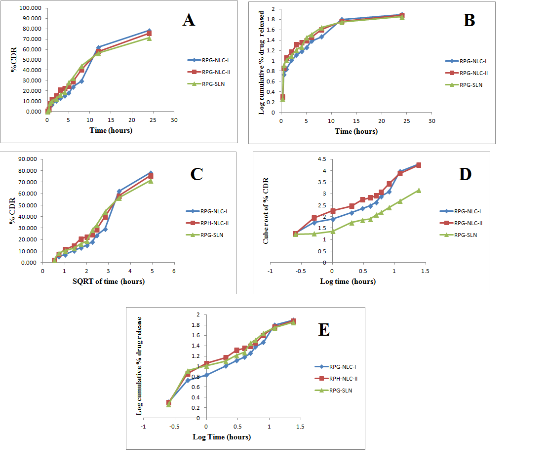 Fig. 6: In vitro release and kinetic of lipid formulation a) Zero order model b) First order model c) Higuchi model d) Korsmeyer peppas model e) Hixon-crowell root model
