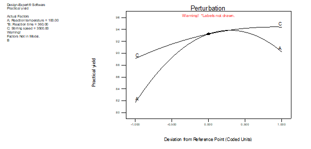 The PY ranged from 77.36 to 94.56 %. The generated quadratic model revealed PY to be significantly impacted by levels of RT (A) and SS (C) without producing any interaction. A good similarity was noted between theoretical and observed values. The influence of main and interactive effects of independent variables on the PY was shown using perturbation (PP), contour (CP) and 3D response surface plots (RSP). (fig. 3A, 3B, 3C)