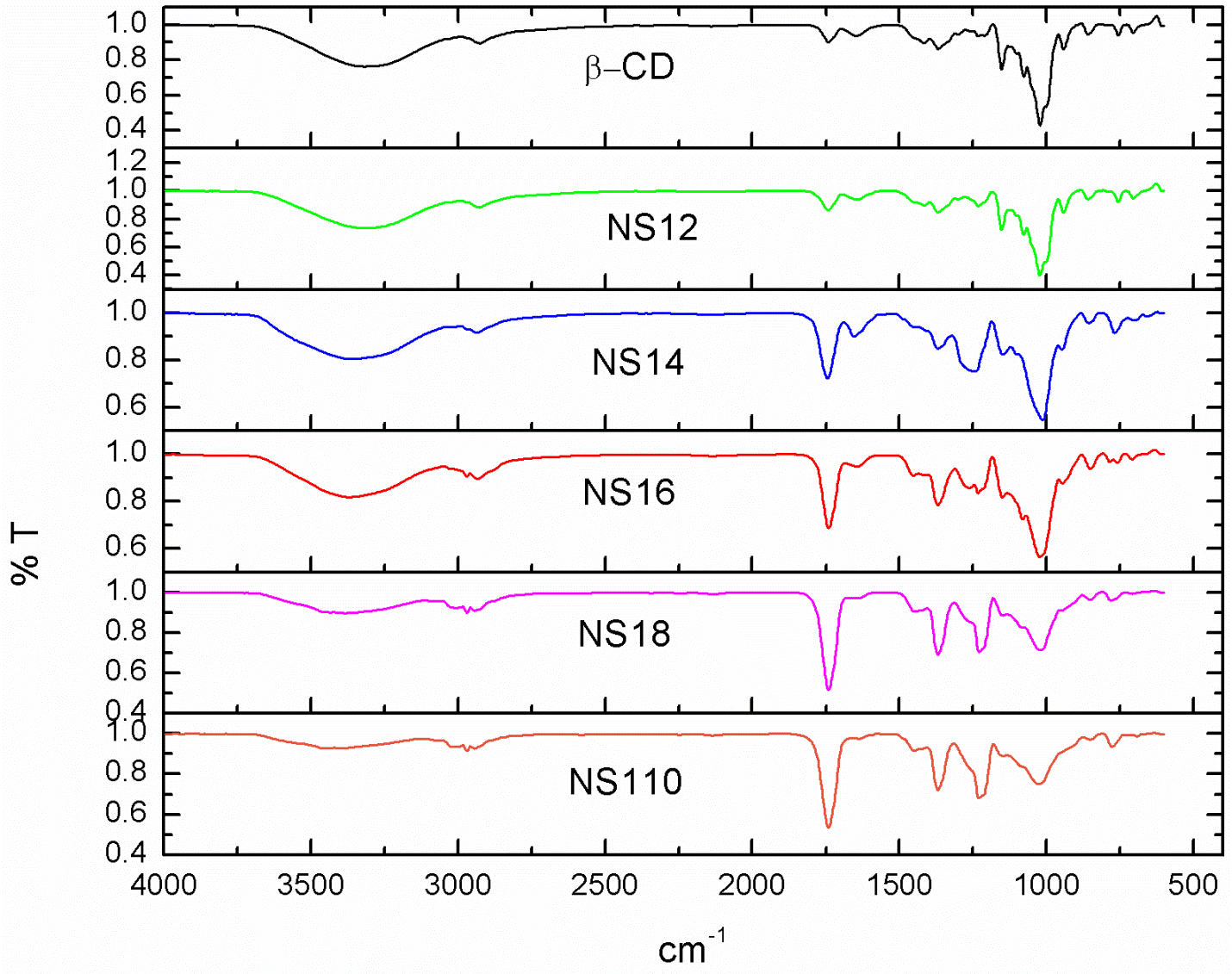 FTIR spectra of β-CD depicted a peak at 1740–1750 cm-1, for C=O bond between two β-CD, which is absent in the spectrum of β-CD (fig. 5), which is a starting material for synthesis of NS. Other distinguishing peaks of NS were observed at 2918 cm-1 owing to C-H stretching vibration, 1418 cm-1 owing to C–H bending vibration and 1026 cm-1 owing to C-O stretching vibration of primary alcohol. An increase in main peak intensity at around 1740–1750 cm-1 was observed in NS spectrum due to an increase in cross-linking degree.