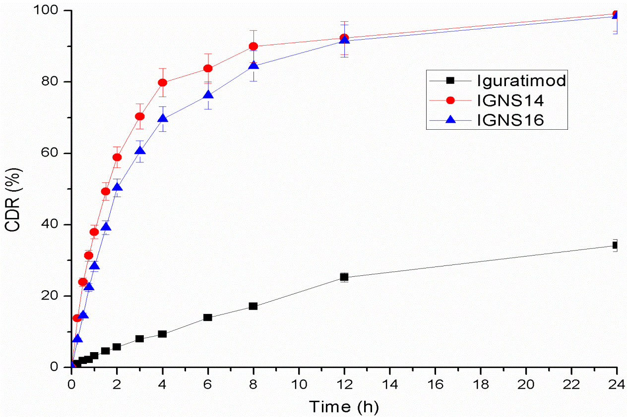 In vitro dissolution pattern of IGD was evaluated from nanosponge formulations (IGNS14 and IGNS16) and free IGD suspension in the simulated gastric medium is shown fig. 8. More than 95 % of the drug was found to be released from nanosponge formulations as compared to only around 34 % from free drug suspension after 24 h of study. In vitro release study of IGD from IGNS16 formulation showed sustained drug release. A slow-paced sustained release of drug indicates diffusion of IGD from within the entrapped NS inclusion complex. The nanosponges (IGNS14) of the lower degree of cross-linking have shown initial rapid burst release and around 38 % of the drug was release within 60 min. This was normally attributed to the fraction of Iguratimod which was adsorbed or encapsulated as a non-inclusion complex on the surface of nanosponges. Upon the addition of the formulation to the release medium, this fraction of the drug was diffused rapidly into the surrounding liquid. Similarly, the nanosponges with a higher degree of cross-linking (IGNS16) have shown a biphasic release pattern of Iguratimod. The observed initial burst release was might be due to the Iguratimod, which is present in the matrix form but not associated with the inclusion complex. Subsequently, sustained release of the drug was observed due to the presence of the drug in the inclusion complex.