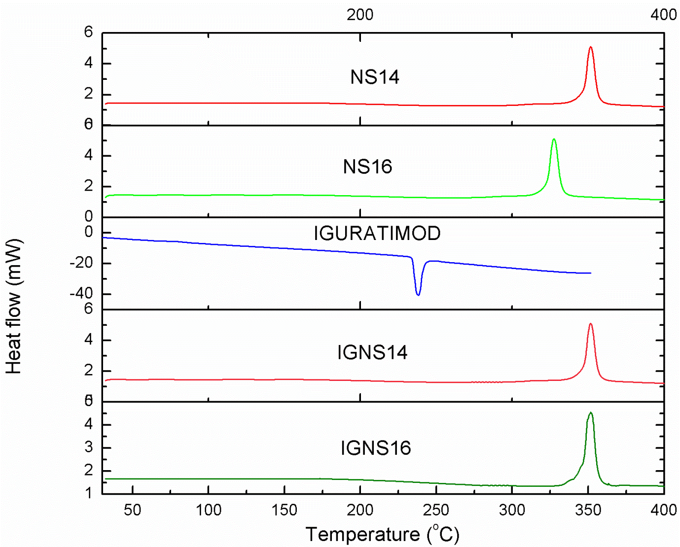 DSC curves of the free IGD, plain NS (NS14 and NS16) and IGD loaded NS complexes (IGNS14 and IGNS16) are displayed in fig. 10. Drug crystalline nature is shown by the presence of sharp endothermic peak at 238.51 °C in DSC thermogram of free drug. The DSC thermogram of plain NS (NS14 and NS16) showed exothermic peaks at around 350 °C. IGD-loaded NS complex (IGNS 14 and IGNS16) also had a broad exothermic peak at around at 350 °C [18].
