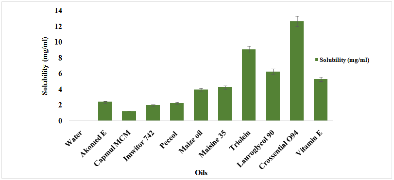 Fig. 1: Solubility of Ibrutinib in various OL, Data is given as mean±standard deviation; (n=3)