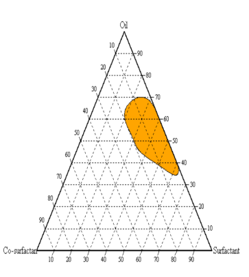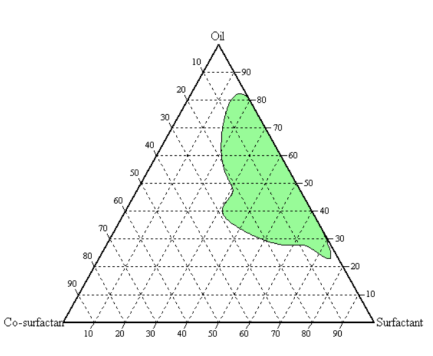 The chosen vehicles from the solubility studies were blended in altered ratios that range from 1:9 to 9:1. Each apex of the triangle was represented by a TPD containing SF, CSF, and OL. CHEMIX software is used to create a pseudo ternary phase diagram [5].