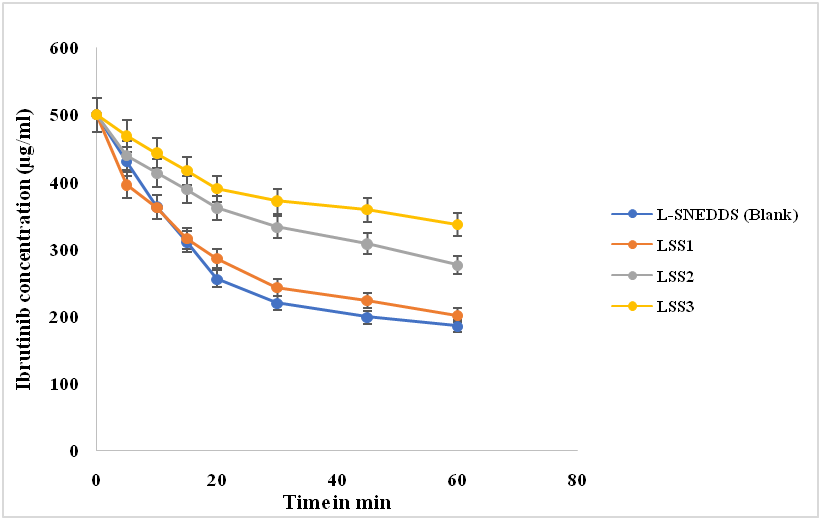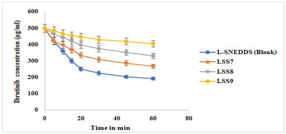 Fig. 7: In vitro concentration release data of Ibrutinib from blank SNEDDS and LSS1-LSS3, Data is given as mean±Standard Deviation; (n=3)