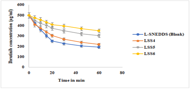 Fig. 8: In vitro concentration release data of Ibrutinib from blank SNEDDS and LSS4-LSS6, Data is given as mean±Standard Deviation; (n=3)