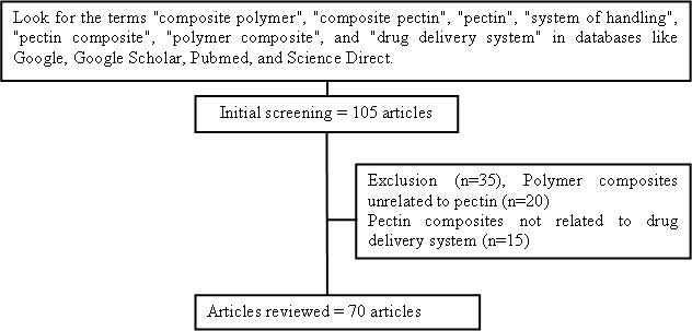 Literature searches obtained from scientific journals published nationally and internationally, journal searches are carried out online through search engines such as Google, Google Scholar, Pubmed and Science Direct with keywords using English in the form of "polymer composites", "composites". pectin”, “pectin”, “drug delivery system”, “pectin”, “pectin composite”, “polymer composite”, and “drug delivery system”. The literature that will be used is then screened for journals with inclusion criteria, namely the time of publication in the range of 2011-2021. Based on the search results using the keywords as mentioned, the article search results chart is obtained as attached in fig. 1.