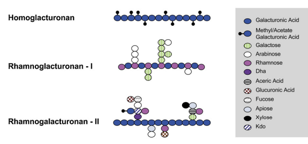 Homogalacturonan is a D-galacturonic acid-based single polymer that can be esterified or methylated. Rhamnogalacturonan I is a molecule made up of galactose and arabinose side chains that are generated by repeating the disaccharide rhamnose-galacturonic acid. Rhamnogalacturonan II, on the other hand, is a homogalacturonan chain with a more complicated side chain [12].