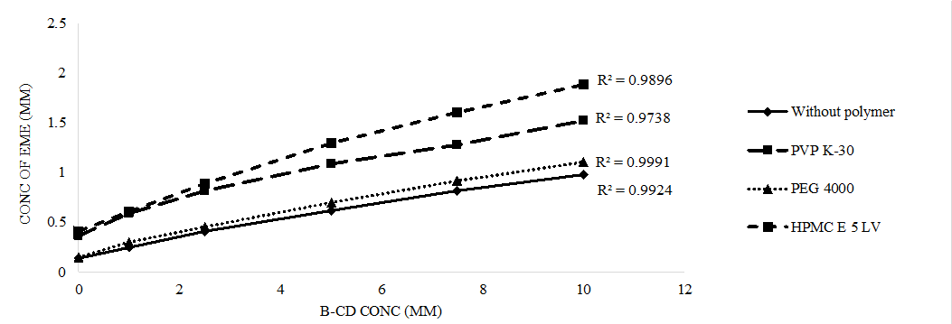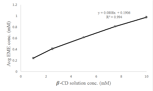 Hydrophilic polymers namely, Polyethylene Glycol–4000 (PEG–4000), Polyvinyl Pyrrolidone (PVP K-30), and Hydroxypropyl Methyl Cellulose (HPMC E-5) were used as co-complexing agents in this investigation because they were found to considerably improve the solubility of visitor molecules with β-CD. Excess EME was added to a 5 ml aqueous β-CD solution (1-10 mmol) containing 0.5 % w/v of each polymer for this test. The suspensions were vortexed for one minute, followed by their filtration by use of 0.22 µm pore size filters [12]. UV-Visible spectroscopy at 252 nm was used to analyze these filtrates for EME estimation.