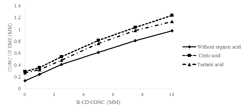 Organic acids viz., Citric and tartaric acid were likewise investigated as ternary agents since they boosted the solubility of guest medicines when blended with β-CD. EME in excess was added in a 5 ml β-CD aqueous solution (1-10 mmol) that contained 0.5 % w/v organic acid [13]. Further processing of these suspensions was done as detailed earlier in section 2.2, with the results of phase solubility data guiding the final choice of co-complexing agent among hydrophilic polymers and organic acids for EME.