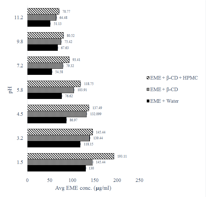 Because EME is a weak basic molecule with a pKa of 5, pH changes have a significant impact on its solubility. As a result, the influence of pH, β-CD, and chosen ternary agent on solubilization of EME was investigated. The pH range of 1.5 to 11.2 was investigated as a useful pH range. Excess EME was added to buffered aqueous solutions containing 1 mmol β-CD alone or in combination with 0.5 %w/v HPMC, and the vials were maintained in a shaker water bath at 37 °C for 48 h. Aliquots from each vial were filtered and the EME concentration was determined using UV-Visible spectroscopy [10, 12].