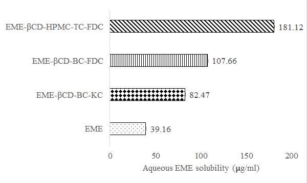 Fig. 5: The saturation solubility data of EME, kneaded binary complex (EME-βCD-BC-KC), freeze-dried binary complex (EME-βCD-BC-FDC), and freeze-dried ternary complex (EME-βCD-HPMC-TC-FDC) (n=3, mean+SD)