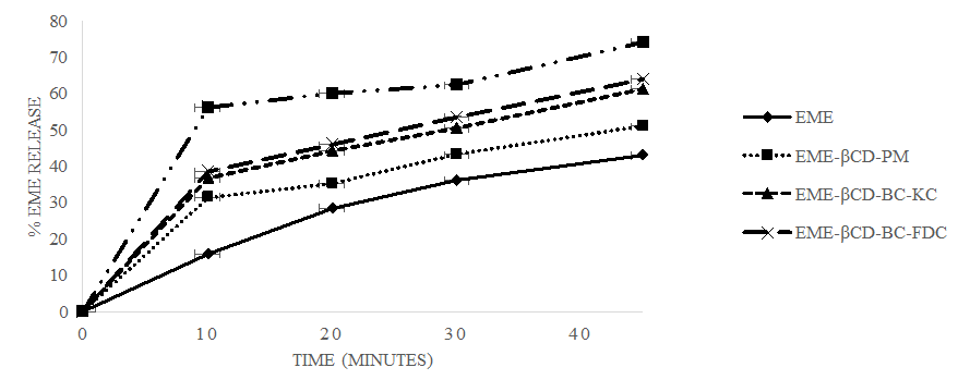 According to USFDA guidelines, dissolution tests were conducted for EME, PM of EME and β-CD, EME-βCD-BC-KC, EME-βCD-BC-FDC, and EME-βCD-HPMC-TC-FDC utilizing the USP-II, paddle-type dissolution test apparatus (Electrolab, India). The experiment was carried out at 37 °C±0.5 °C at 100 rpm with 900 ml of 0.5% sodium lauryl sulphate solution as a dissolution medium. After 10, 20, 30, and 45 min, aliquots from samples containing 25 mg of EME or its equivalent in PMs, binary, and ternary complexes were withdrawn, and the corresponding quantity of new dissolving medium was added to maintain sink conditions. The EME content of these aliquots was measured using UV-Visible spectroscopy after they were filtered (0.22 m pores size). The data was shown as a percentage of EME released versus time [6].